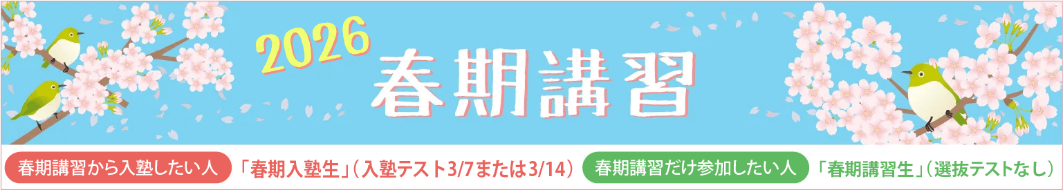 次回入塾テスト:1/31(土)、2/7(土)または8(日)、2/14(土)または15(日)、2/21(土) 新年度入塾生募集 - 2026年1月20日お知らせ