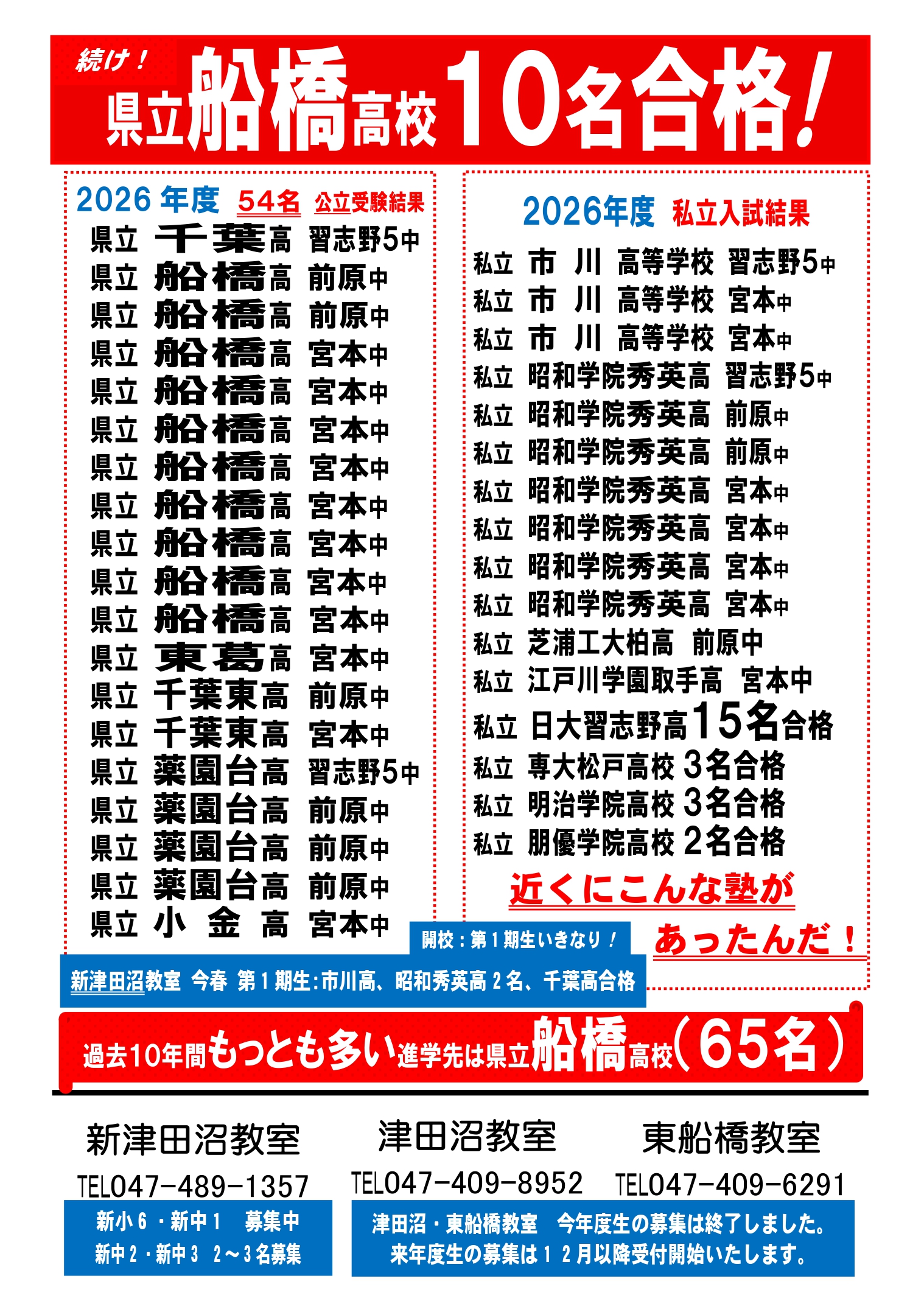 小さい教室で、1学年の人数が限られます。そのため、年によって実績は変動しますが、毎年、難関上位高校に多数の生徒が合格しています。詳しくは東船橋教室用の入塾案内をご覧ください。
