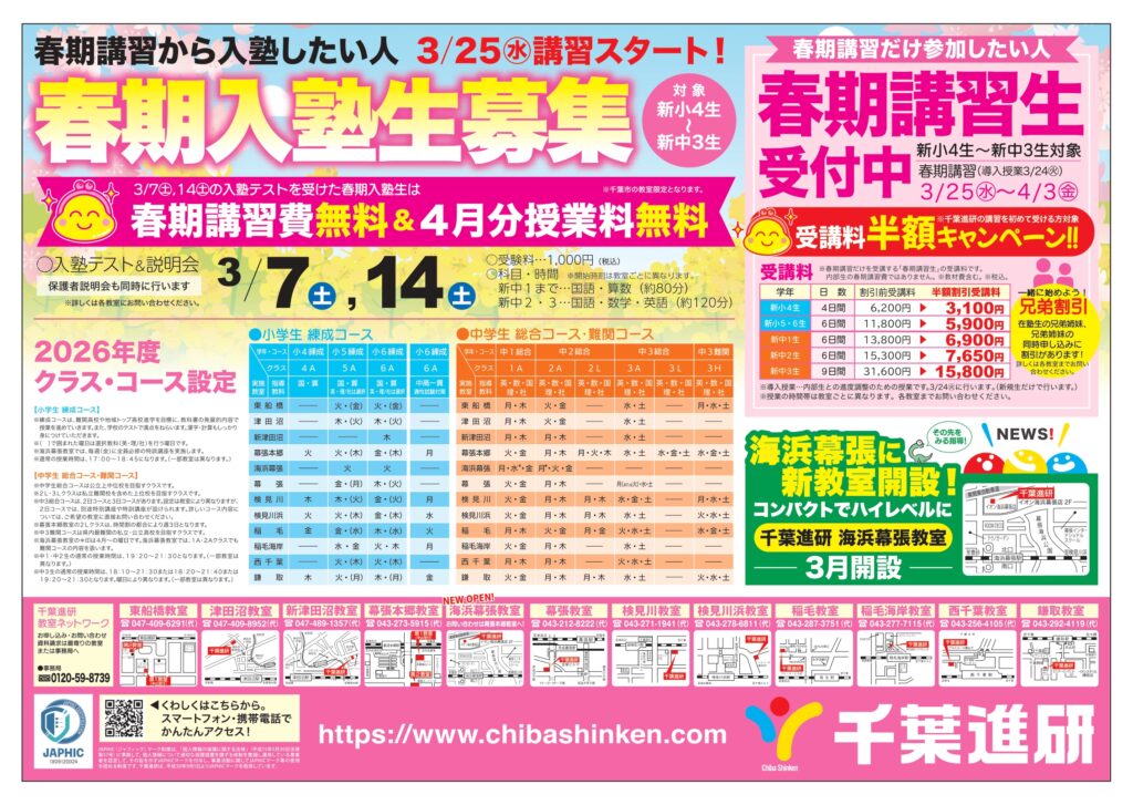 ※お子さまが入塾テストを受験されている間に入塾説明会を行わせていただきます。必ずご出席ください。